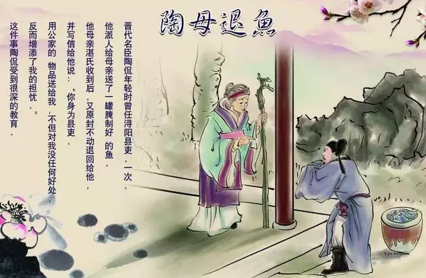 有一次,一位下属送了一坛鱼鲊(腌鱼)给陶侃,孝顺的陶侃马上念及一生贫居乡间的慈母,便嘱托乡人带给母亲。